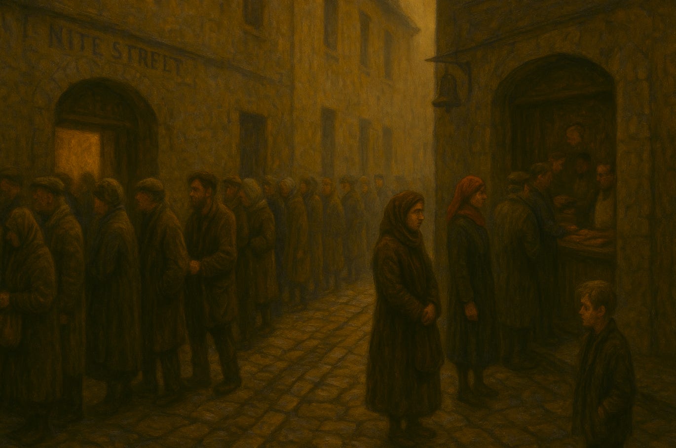 Jor stands in bread. He looks at the meat bell and counts his coins. A boy slips from meat to bread and nobody scolds him because bread forgives the poor. When the bell rings a second time, a woman in a red scarf lifts her chin and stays where she is. Tripe is for those who can boil it long without counting the fuel. She cannot. Bread will be supper, not stew, and that is a class in one decision.