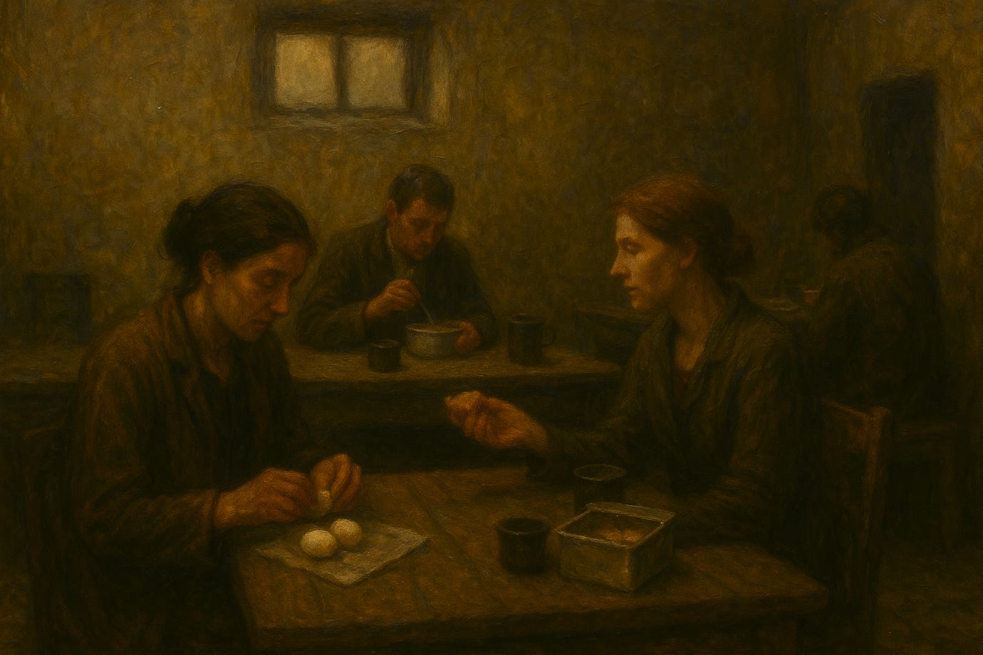 Write 180 to 220 words. Set your character within a food moment where class shapes choice. A queue, a staff meal, a gift at a door, a potluck. No lectures. Show the bite, the pause, the deal.