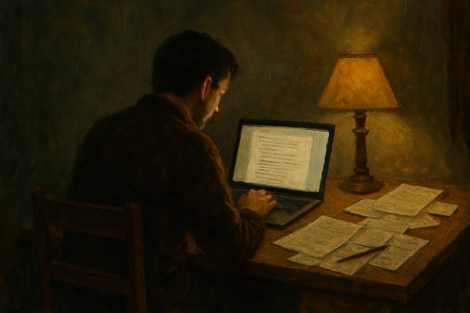 Midnight. The house is still except for the hum of the fridge and the slow heartbeat of the cursor. Mug, half-finished. Notes scattered. An idea keeps flashing: a city of light that never forgives. Big, sharp, promising. But where to begin.